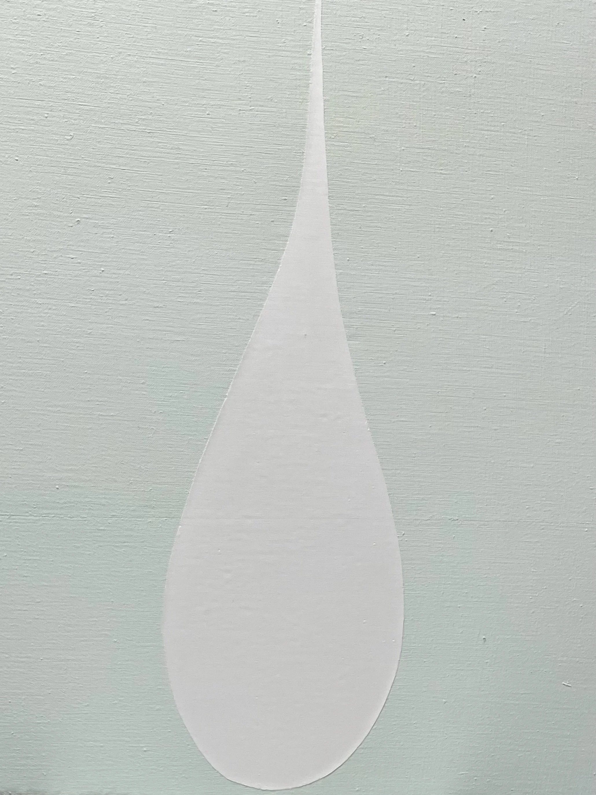 Bildene (kunstforeningen har til sammen tre verk) utgjør en del av et triptykon (det vil si en tredelt billedfremstilling som innholdsmessig er knyttet sammen), og de er nesten identiske arbeider. Men de er ikke identiske. Se nøye etter; oppdager du nyanseforskjellene? Vi må skjerpe blikket og åpne sansene våre for disse ørsmå, subtile endringene. Vi må bli med på A K Dolvens formale utforskning av forholdet mellom bakgrunnsfarge og form; hva skjer når fargetoner og tekstur endres, og hva skjer når de endres så lite? Rent innholdsmessig kan det være at du tenker på en dråpe vann, en dråpe blod, en dråpe av glass, en tåre - eller rett og slett noe helt annet?